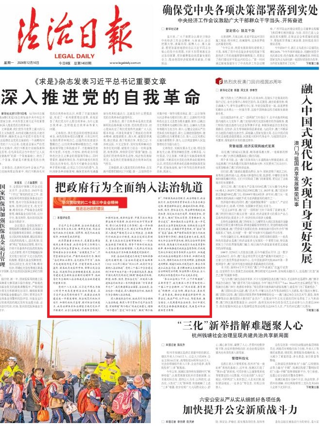 2024年12月16日法治日报发表评论员文章《把政府行为全面纳入法治轨道》