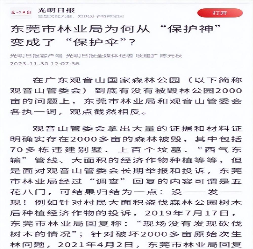 光明日报的报道:林业局本是森林公园的保护神,但在许多人眼里东莞市林业局却以实际行动证明自己已成了一些破坏森林者们的保护伞!成为了刘志庚家族强夺观音山公园的“打手”。