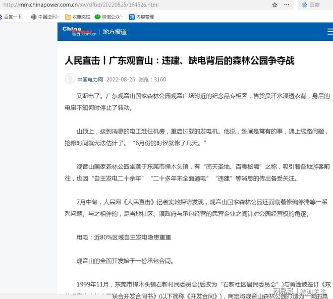 中国电力网转载的人民网采写的《广东观音山:违建、缺电背后的森林公园争夺战》,曝光了观音山公园修编停滞、四界不清、被诉违建毁林等情况。