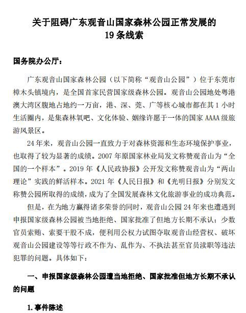 2023年8月8日,广东观音山国家森林公园向国务院办公厅致函反映阻碍正常发展的19条线索。