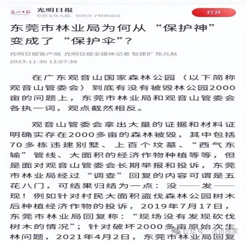 光明日报的报道:林业局本是森林公园的保护神,但在许多人眼里东莞市林业局却以实际行动证明自己已成了一些破坏森林者们的保护伞!成为了刘志庚家族强夺观音山公园的“打手”。