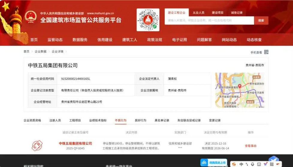 对此,《经济参考报》记者拨打中铁五局官网披露的联系方式尝试进一步了解,截至发稿电话未能接通。 记者查询后发现,这并非公司近年来首次被通报。2024年10月,中铁五局下属的中铁五局集团机械化工程有限公司,在格库铁路七个泉站铁路线路安全保护区内施工作业过程中,不遵守保证铁路安全的施工安全规范,导致挖断电缆,构成铁路交通一般事故。2025年4月10日,兰州铁路监督管理局给予该公司罚款60000元的行政处罚。 2025年10月,海口市住建局发布建筑工地文明施工红黑榜,中铁五局因其负责施工的项目现场未能较好地落实“六个百分百”要求,施工现场(美玉村碎石厂)未保持整洁、未采取有效设施防止尘土污染环境上了黑榜。
