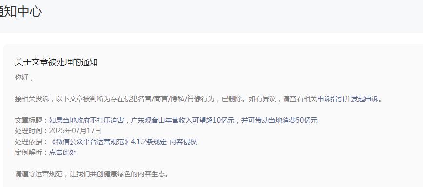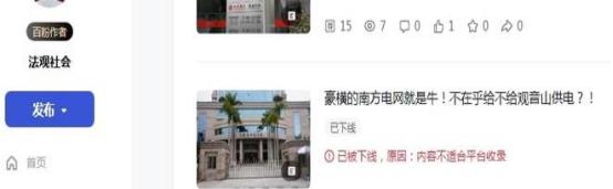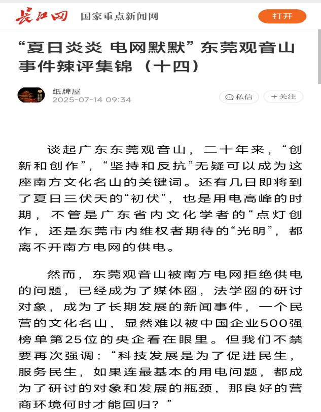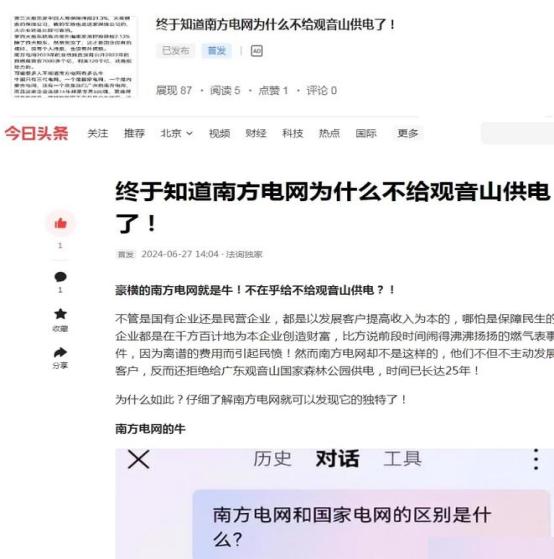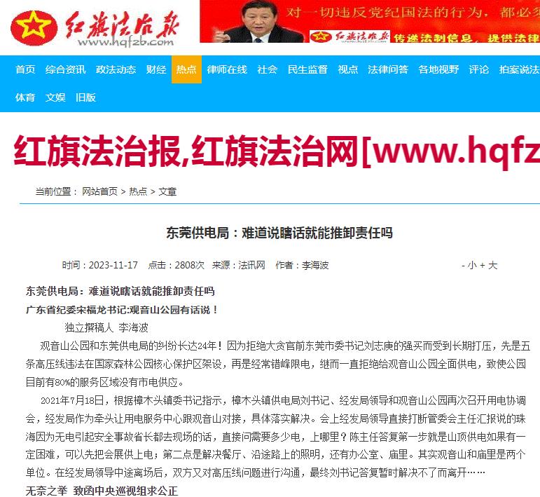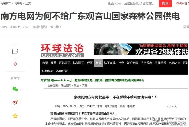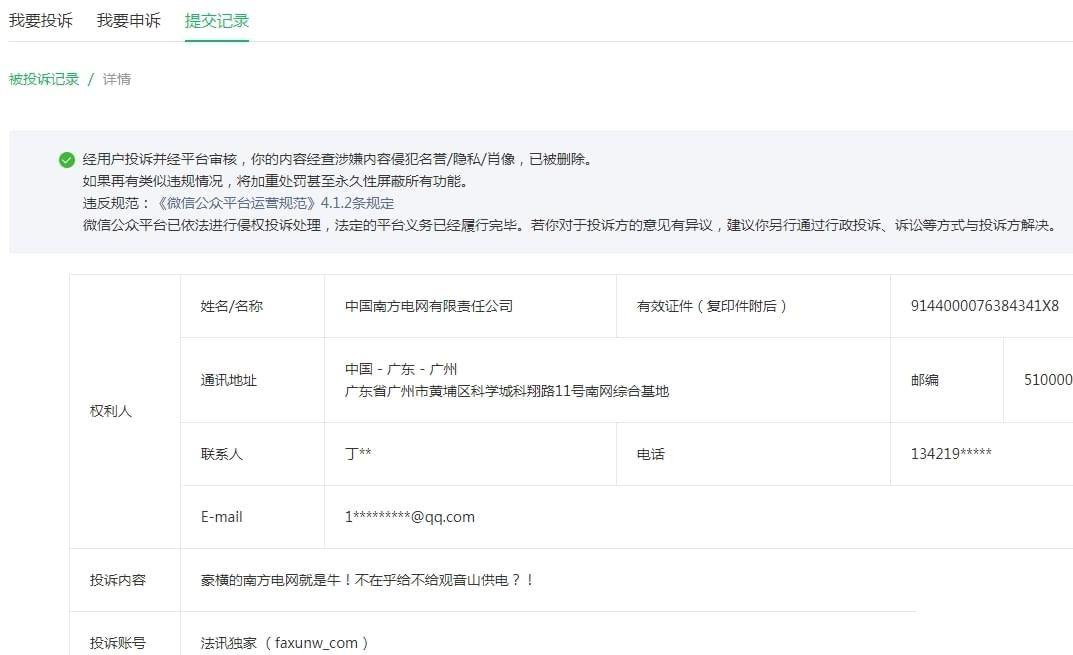 在19:53,微信公众号即发来通知,确认“你的内容经查涉嫌内容侵犯名誉/隐私/肖像,已被删除”。 微信公众号的动作之快,实属罕见!因为之前被投诉时,基本上都是5天左右才确定。这次删除文章,根本就不给作者提供申诉的时间。 不但如此,在国内备案的一些网站也收到了当地相关部门的通知,要求删除转载的该文章网页。 ![]() 有网站转发了该文,在6月28日中午收到了属地网信办的通知,告知是12377平台举报的,市级转交下来的,要求删除。 在6月28日15:52,某网站负责人接到了保定市某居委会的电话,说是转发的文章需要删除,上级部门联系不上才通知居委会的。![]() 网易号“法询独家”发布的《终于知道南方电网为什么不给观音山供电了!》在展现803次后没有通知,直接下线! ![]() 百家号也是直接下线,没有任何通知 ![]() 今日头条没有下线,但就是不能分享 想一想,南方电网作为副部级的央企,在南方有着独特的垄断地位,谁敢不服?!断你的电,你还不老实?!微信公众号属于腾讯的,腾讯不听话?断你一小时的电,你就难受要命,更别说像观音山公园那样的小民企,实行错峰供电,你能正常营业吗?一篇文章,删就删了呗! 我们看看网络上现在还存在这些南方电网和观音山问题的帖子吧:《公园要求用电可以吗?专家:不能拒绝供电》、《南方电网对东莞民企的伤害有多深?社会影响有多坏?反馈来了》、《东莞供电局 难道说瞎话就能推卸责任吗》、《豪横的南方电网就是牛!不在乎给不给观音山供电?!》、《南方电网,果然豪横无耻!》、《南方电网孟振平董事长:您知道拒绝给公园供电阻碍了民营企业的发展吗 》。![]() 除了这些撰稿人反映南方电网与观音山公园的供电纠纷外,网络搜索其内容多达数百篇:《观音山公司诉南方电网等侵权案在广东开庭》、《东莞维权有多难?供电部门22年不给民企观音山供电》、《东莞市电力部门长期拒绝给观音山国家森林公园供电何解》、《广东观音山国家森林公园依法申请用电 东莞供电局长期拒绝供电并企图推卸责任》、《“小香港”之称的繁荣地,存在未通市政电力之现象》、《广东观音山国家森林公园多年缺电频遭毁林的背后》、《首座民营国家级森林公园遇通电难题 欲借纾困潮破局》、《“电老虎”现形记:东莞国家级景区供电被卡脖子23年》、《自主供电23年 广东观音山国家森林公园何时全面通电》、《东莞民企艰难发展之路:在那些没电的日子里》、《国家森林公园遭遇“电老虎” 24年用电问题悬而未决》、《东莞民企给供电局送“锦旗”,希望解决公园80%服务区域用电》、《给国家森林公园供电 点亮东莞民企发展的希望》、《广东观音山如何从黑夜走向万家灯火》、《25年经营权争夺余波:观音山国家森林公园遭电力部门“卡脖》、《25年黑灯瞎火,东莞民企送锦旗只为能见“光明”》、《南方电网对东莞民企的伤害有多深?社会影响有多坏》、《南方电网为何不给广东观音山国家森林公园供电》、《东莞观音山致南方电网公司及其董事长孟振平先生公开信》、《权威专家说法:谁来管一管南方电网东莞供电公司》、《东莞观音山指南方电网董事长阻碍其发展》、《南方电网为何不给广东观音山国家森林公园供电》、《专家说法:北京专家研讨广东观音山被南方电网拒供电》、《电网线塔建在国家级森林公园里,破坏森林隐患大》、《4A景区25年没有正常供电 竟发生在今天的东莞》、《国家森林公园遭遇“电老虎” 24年用电问题悬而未决》、《讽刺漫画《电霸作恶》直指电力老虎对待观音山二十载奇事(二十)》、《名家评论第七期:北京专家研讨广东观音山国家森林公园被南方电网拒绝供电事件(四)》、《“观音山上观山水 供电局旁无电供”观音山事件辣评》、《“夏日炎炎 电网默默” 东莞观音山事件辣评集锦(十四)》...... 对此,公园董事长黄淦波先生及广大的读者们就不解了:一个副部级的垄断型央企,违法违纪恶招二十五年不断,其上级居然能不管不问?!在中国的99个央企中,南方电网算是超级另类吧? 在4月29日发布的《国家森林公园遭遇“电老虎” 24年用电问题悬而未决》文末撰稿人如此问南方电网孟振平董事长:长期在电力系统任职的孟振平董事长能有所作为吗?!还会继续派人来删文章吗?南方电网还是央企吗?答案是显而易见的:孟振平董事长不听民声,再是一味地实行删文章来掩耳盗铃! 孟振平董事长可知“文章千古好,仕途一时荣!”保不齐那一天,您会不会因为某件事而遗臭万年呢,毕竟,作为从事国民经济的基础产业和国计民生的公用事业的央企一把手,您在其位任由丑事不断而不谋其政,谁知道你在干嘛呢?!自己真的干净吗?南方电网有限责任公司原党组成员、纪检监察组组长龙飞还不是因为受贿被判刑7年呢! 删帖删的是一时帖子,但删不掉一世骂名!宗老生前一直宣称只有一个女儿,在去世后几年就曝出了7个子女争家产的事件呢!家族遗产纠纷发酵引起了销量下滑。所以,人,不能心存侥幸,总有一天,会大白天下。南方电网的孟董事长啊你须知:“人在做,天在看!” 纵观公园内的森林资源被毁而被违法建了几十个高压线铁塔,再到刘志庚(已被判无期徒刑)以市委书记的身份命令供电部门随时中止对公园的供电及二十五年恶意不对公园内80%面积的供电,南方电网及下属机构对东莞贪官的言听计