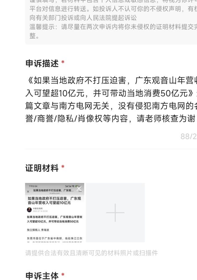 | 南方电网,删帖招数不断为哪般 孟振平董事长可知:南方电网删掉的是帖子,失去的却是人心 独立撰稿人 李海波 日前,撰稿人登录今日头条后台发现,发布的《不打压迫害,广东观音山年营收入可望超10亿元》被投诉删帖了。而投诉人却是广东电网公司东莞供电局! ![]() 东莞供电局的举报描述是:“从2014年起,观音山公司多次通过各类平台发布不实信息。其中,针对供电部门的不实舆情主要为公园供电受阻致26年来近80%区域依赖自发电、供电部门擅架线塔侵权,以及倒推涉电安全隐患责任等内容。事实上,自2003年起,东莞供电局便一直向公园提供供电服务。根据《供用电合同》将电力供应至公园的产权分界点。在高压线塔架设纠纷中,观音山公司三次诉讼均败诉,法院认定线路建设早于公四承包经营,未构成侵权。而涉电安全隐患是公园经营方擅自在1995年建成的110千伏线路下方修建栈道所致,东莞供电局已向公园发出整改通知,其拒绝签收且拒不整改,鉴于相关文章存在不良舆论导向,致使不实内容广泛扩散,已对我司企业形象造成影响,恳请及时删除、屏蔽相关链接。” 明明是写观音山的发展情况,怎么就牵涉南方电网了呢?