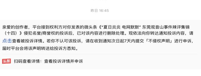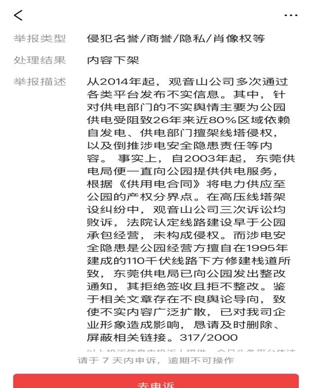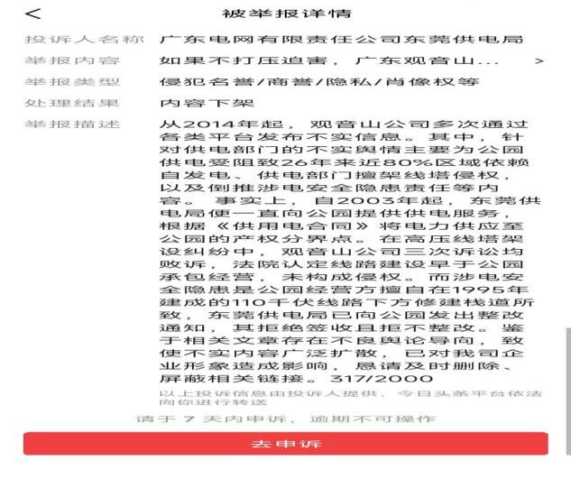 于是撰稿人仔细查看了这篇1万余字的文章,发现了又这么100字提及了南方电网问题“特别是南方电网属下的东莞市供电局拒绝给公园供电:2020年12月22日央视《谈事说理》栏目播出专题“《谈事说理》之搁浅的公园”其中就着重谈到观音山国家森林公园悬而未决的基本供电问题,之后全网和知名专家为之呼吁至今仍未解决。”同时配了一幅网文截图。 ![]() 微信公众号的该文也被下架 ![]() 值得疑惑的是,微信公众号“被投诉记录”里却没有相关信息 如此小题大做的投诉删帖,看来是南方电网又来当东莞当地的打手,来混淆视听吧?! ![]() 明知道申诉没有结果,但法讯君还是按照程序在17日的17:58提起了申诉。自己的权利,总归还是要争取的,至于今日头条这些平台只为自己利益着想,那就随他吧! 在当天晚上23:23,今日头条对撰稿人的申诉有了答复:亲爱的创作者,你提交的「不侵权声明」单号6115714不符合法定要求,原因:你的申诉理由不充分。如你认为被投诉文章不存在侵权,请具体明确指出,并针对投诉理由作出回应、提交对应证明材料。若需要补充举证,请在收到通知次日起7天内点击提交「不侵权声明」。 ![]() 今日头条后台,某创作者也是这样被通知下架的。 ![]() 除了撰稿人的帖子被南方电网东莞市供电局删除外,也有其他媒体人的今日头条帖子《“夏日炎炎电网默默”东莞观音山事件辣评集锦(十四)》被同样理由删除。 看看东莞供电局的删帖理由,挺奇葩的吧!申请理由严重不实! 一是“从2014年起,观音山公司多次通过各类平台发布不实信息,其中,针对供电部门的不实舆情主要为公园供电受阻致26年来近80%区域依赖自发电、供电部门擅架线塔侵权,以及倒推涉电安全隐患责任等内容。”,纵观观音山事件,发布的网络平台包括媒体,有中央电视台、人民日报、人民网、光明日报、经济参考报等中央媒体呢!他们发布的是不实信息?!![]() 公园自主发电机房,年支出是市政供电的3、4倍! 二是“自2003年起,东莞供电局便一直向公园提供供电服务”,但观音山公园没有说供电局没有完全供电,而是在公园区域有80%没有供电,26年来向东莞供电局申请全员供电而被推诿拒绝吗?还有在2021年7月18日,根据樟木头镇委书记指示,樟木头镇供电局刘书记、经发局领导和观音山公园再次召开用电协调会,经发局作为牵头让用电服务中心跟观音山对接,具体落实解决。会上经发局领导直接打断管委会主任汇报说的珠海因为无电引起安全事故省长都去现场的话,直接问需要多少电,上哪里?陈主任答复第一步就是山顶供电如果有一定困难,可以先把会展供上电;第二点是解决餐厅、沿途路上的照明,还有办公室、庙里。其实观音山和庙里是两个单位。在经发局领导中途离场后,双方又对高压线问题进行沟通,最终刘书记答复暂时解决不了而离开……会议纪要显示的该情节,如果不是拒绝供电,刘书记会参会吗?! 三是“根据《供用电合同》将电力供应至公园的产权分界点。在高压线塔架设纠纷中,观音山公司三次诉讼均败诉,法院认定线路建设早于公司承包经营,未构成侵权。”就此案件,多位法学专家认为:案涉四条高压线路的真实初始修建时间和是否为观音山公司承包前就已存续存在一定争议,一审、二审法院直接认定属观音山公司承包前已存续或变更升级改造而来是否得当?为何观音山均败诉?法院认为这些高压线并未架设在公园的红线范围内,故供电部门没错。而公园提供给法院证明高压线确实架设在公园范围内的证据文件《观音山国家森林公园总体规划》以及各工程施工的时间等均未被法院认可。出现这种结局,如果说此案没有行政力量干预司法,鬼都不信!
